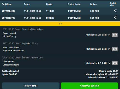 Pozdrav burazeri. Gledao sam obe utakmice Bolivije. Moglo je biti i više golova ali najvažnije da je tip 1+I&2+II prošao. UAE takođe na obe prošao ovaj tip. Nadam se da je neko ispratio ovaj tiket s kvotom 23.87. Danas UAE 4 utakmice. Nerealno je očekivati da i danas na sve 4 prođe 1+I&2+II ali kvota tiketa je 28.36 pinnbet, za 175 din. 5100 din. dobitak s bonusom. Uplatio sam za 440 din. i na sve 4 tip 1+I&3+ kvota tiketa 8.94, za 4000 s bonusom. Rizična su oba tiketa ali nadam se golovima. Prva počinje za 15ak min. pa sam skratio tekst. Ko isprati sretno.