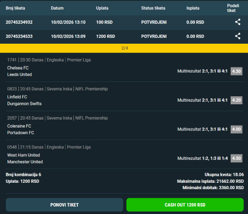 Pozdrav burazeri. APP tiket: Millonarios - America De Cali 1-1 2.40, Pasto - U. Magdalena 1-1 2.20, o ove dve utakmice sam pisao u prethodnoj objavi. Athletico-PR - Fortaleza 1-1 2.25, revanš utakmica, prva 0:0. Paragvaj - Honduras tm1 2+, USA - Jamaica tm1 2+ 1.62, Peru - Costa Rica tm1 2+ 1.75, sve 3 prijateljske utakmice, očekujem da tip tm1 2+ lagano prođe. Kvota tiketa 63.99 Pinnbet, moj ulog 150 din. za 10500 s bonusom. Nešto sigurnija varijanta - na prve 3 ki 1 , ostale 3 tm1 2+ , kvota 16.40 , moj ulog 600 din. za 10800 s bonusom. Ja sam uplatio oba tiketa pa kome se šta dopadne neka isprati. Sretno. Za lovce na kvote , dubl: Paragvaj - Honduras 2+ prvo i 4+ cela 6.50, Peru - Costa Rica 2+ prvo i 4+ cela 5.25 , kvota 34.13 , moj ulog 150 din. za 5100.