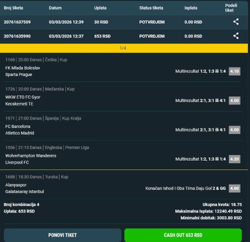 Dobro jutro burazeri. Završnica playoffa u Kini. Na nama 4 dobro poznata tima čeka nas 4 meča a direktne prenose , nadam se, gledaćemo u kladionicama Maxbeta. U borbi za 3.mesto danas od 12:35 Shanghai SIPG - Beijing Guoan prvi meč , revanš se igra 11-tog. Sutra prvi meč finala od 12:35 Jiangsu Suning - Guangzhou Evergrande revanš meč 12-tog. Utakmice se igraju na neutralnom terenu , što je meni ( a verujem i vama) dodatni motiv pojuriti bar GG ili GG3+ na ovim mečevima. Ja ću ići na sva 4 meča sa po 4 singla. Tipovi igre: GGI , GGII , D2+&G2+ , GGI&GGII . Za današnji meč , kvote na ove tipove igre vide se na trenutnoj profilnoj slici. Tiket uplaćen samo da bi se videli tipovi igre i kvote. I ako ću na sva 4 meča ići sa po 4 singla , kvote za sutrašnji meč ( a ni za revanš mečeve). trenutno nisu važne. Bitno , da su kvote slične za svaki pojedinačni tip igre. Znam da dosta nas često ide na duplanje , pojuri neku piramidu (bar u 3-5 koraka) i slično. U takvim slučajevima većinom idemo na manje kvote. Ubeđen sam da bi dosta burazera pojurilo bar GGI ili GGII na minimum jednom od ova 4 meča i da niko od nas to ne predloži. Moj predlog je to da se ovi rizučniji tipovi igre pojure tehničko taktičkim potezem. Za ovu taktiku potrebno je strpljenje jer se poslednji meč igra 12-tog. Idemo na sva 4 meča sa singlovima a uslov za zaradu je tip GG u bar jednom od poluvremena na bar jednom meču. . Već duži period igramo na ove timove i statistika nam je poznata. Kome nije neka pregleda. Smatram da nije potrebno pisati analizu bez obzira što je Shanghai SIPG pobeđivao na zadnjih 5-6 međusobnih. Beijing Guoan je po kladionicama blagi favorit - po meni bolje juriti golove. Za one koji odluče da isprate ovo , moj predlog je da ukupan ulog na ova 4 tipa rasporedi tako da je eventualni dobitak po singlu isti ili sličan iznos. Kada uplatite singlove za današnji meč i sami ćete videti da ima zarade i ako prođe najmanje plaćen tip tj GGII . Ja ću i današnji i sutrašnji meč da zategnem s ukupnim ulogom ali taktički. Ukoliko danas ne bi prošao ni 1 od 4 singla , sutra idem na jači ukupan ulog.. Ako kojim slučajem na oba meča padnu singlovi , na 3 meč idem na još jači ulog a u najgorem slučaju išao bih na 4 meč još jače. To je u slučaju da baš nema sportske sreće. . Verujem da niko od onih koji će ispratiti ovo nije baš toliki pesimista. Naravno tu je i opcija prolaska bar jednog singla već na današnjem meču. Ako bi danas prošao samo 1 od ova 2 tipa s kvotama 4.70 i 3.30 , sutra bih taj dobitak rasporedio na naredna 4 singla. Ukoliko bi danas prošla bar 2 tipa igre , taktika je nešto drugačija , zarada se zadržava a ukupan početni ulog na današnje singlove bih rasporedio na sutrašnje. Naravno išao bih i sa nešto jačim početnim ulogom na sutrašnji meč kada bi se danas Kinezi raspucali. Ja se lično nadam da će na bar jednom od 4 meča proći tip GGI&GGII. Zato rizikujem malo više. Ko nije spreman za toliki rizik , može da proba bez ovog tipa igre. Ovaj metod igre se može ispratiti i sa po 3 singla na ostale tipove igre. I u tom slučaju , taktika ista - rasporediti ukupan ulog na singlove da eventualni dobitak po singlu bude isti isli sličan . Ko isprati sretno.