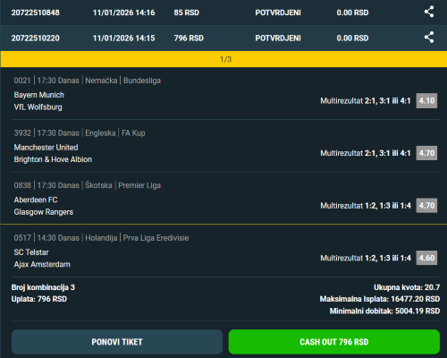Pozdrav burazeri. Nadam se da ste i vi juče dobro prošli. Naravno to zavisi i šta ko ispratio. Tip igre 2&2+ kao i golovi gostujućih timova u raznim varijantama lagano prošlo. Porto takođe odradio svoje. LDU Quito oborio tiket s tipom 1&2+ tako da nisam baš zadovoljan Beveren nije postigao gol za ekstra zaradu na tripl s tipom multi rezultat ali je prošao dubl na preostala 2 meča. Naravno i ta 2 singla. Danas ću opet krenuti od multi rezultata. Ko ne igra ovaj tip igre , nije loše da pogleda profilnu sliku. Može biti od koristi i za neke druge tipove igre. Na profilnoj sistem 4/9 kvote Meridian. Nisam ubeđen u prolaz sistema ali rezona ima pojuriti multi na svih 9 mečeva. Veća verovatnoća sistema je ako odigrate 2/5 , 2/6 , 3/6 i sl. Kada pogledate statistiku izbacite sumnjive mečeve. Ja idem sa 4/9 u slučaju da utrči neki pogodak viška. Moja preporuka je 1-2 tripla , 5-6 dublova , nekoliko singlova na multi. To ću i ja uplatiti nakon puštanja objave. Ko ne igra u Meridianu, može iskombinovati 1&GG , 2&GG na 2-4 meča i eto lepog tiketa. Nisu loše kvote ni za nešto manje rizični tip igre GG&favorit2+ . Daću jedan primer : 16:00 Adana Demirspor - Tuzlaspor GG&D2+ 2.70 , 16:35 Al Qadisiya - Kazma SC GG&D2+ 3.20 , ukupno 8.64 Balkanbet. Malo li je? Kad pogledamo statistiku , oba meča veoma neizvesna . Kako igraju gostujući timovi nikakvo iznenađenje da postignu bar po gol, Da li je nerealno očekivati i po bar 2 gola favorita procenite. Istina na ovaj tip igre ima dosta izglednijih mečeva za prolaz . Ovaj dubl odigrao zbog vremenskog termina. Izglednije mečeve za prolaz ovog tipa igre kombinovaću sa bar 3-4 meča na tiketima. Te tikete i tikete s tipom igre 1&2+ , 2&2+ , kao i tim 2+ uplatiću takođe nakon puštanja objave. Smatram da nije problem da to iskombinujete i sami. Poenta je da sam hteo da skrenem pažnju na ove mečeve. Pošto na narednu objavu imam pravo tek oko 19:30 biće još predloga u komentarima ove objave. Nisam siguran da ću stići pre 16:30 - ima se nekih obaveza. Zato jedan APP tripl s tipom GG : UTA Arad - Astra 2.10 , Burnley - Wolves 2.12 , Tenerife - Girona 2.25 , ukupno 10.02 Maxbet . Na mnogo mečeva danas lakše uhvatiti GG i GG3+ nego na ova 3. Takve tikete ostavljam za kasnije. Za ovaj tripl odlučio sam se nakon gledanja statistike. Rezona za GG ima , makar tankih a kvota tripla OK. Toliko za sada. Ko isprati neke od mečeva sretno.