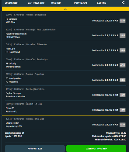 Za ovu objavu samo 4 meča. Hatayspor - Besiktas 2&GG 3.60 , Beerschot VA - Gent 2&GG 3.10 , Leuven - Anderlecht 2&GG 3.10 , St. Truiden - Club Brugge 2&GG 2.85 kvota tiketa 98.60 Maxbet . Ovo sam odigrao i kao triplove i dublove. Bešiktaš zadnjih 5 kola nije primio gol , vreme je. Kod Belgijanaca sam išao i sa tipom igre GG6G2+ , na sva 4 meča išao i sa tipom igre gost 2+ kvota tiketa 6.66 Maxbet. U Meridianu uplaćujem i multi na sva 4 meča ali tek kad pustim objavu. Nisam stigao ranije. Idem sa klasičnim 1:2 , 1:3 , 1:4 na sva 4 meča u singlovima i dublovima. ako stignem i 3/4 i 4 u glavu. Toliko da bi se stiglo ispratiti. Sretno.