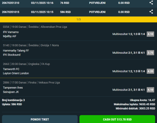 Pozdrav burazeri. U tekstu objave samo par riičnijih tiketa . Podeliću sa vama ono što sam za sada uplatio. Danas imam problem s pregledom statistike za mečeve koje planiram na tiketima. Zbog toga sam se odlučio da pustim objavu ovakvu kakva jeste. Nadam se kasnije u komentarima i tiketi s manje rizičnim tipovima igre. Na nekoliko današnjih favorita i njihove golove tek treba da uplatim tikete. Za početak dana par APP tiketa i lov na kvote. 18:00 Wisla - Zaglebie D2+&G2+ 5.30 , 19:00 Freiburg II - Wehen D2+&G2+ 5.25 , kvota dubla 27.82 Maxbet. Nešto manje rizična varijanta - na oba meča GG4+ kvota dubla 9.61 Maxbet . U Merkuru na oba meča GG&1+I&1+II , kvota dubla trenutno 4.39 . Nešto malo su pale kvote za ovaj tip igre kada sam uplatio dubl. Pre toga sam uplatio tiket s profilne slike kao i ova 2 meča u fiksu i 1/3 GG&1+I&1+II na preostala 3 meča sa slike. I Šveđani i Rumuni su mi malo sumnjivi na ovaj tip igre . Ipak na Rumune sam išao i sa 2&GG u par dublova. Danas sam opet na Dinamo Bukureš singlirao pobedu uz GG 8.20 Meridian. Nisu mi tako primamljivi kao prošli put . 2&GG 7.30 sam u jednom dublu vezao sa Islanđanima KR Reykjavik - Fylkir 1&GG 2.70 ,. Kvota dubla 19.71 Maxbet. U Merkuru ponovio po kvoti 19.20 . Da li će se opet isplatiti rizik na Rumune i Islanđane , videćemo. Kažu neće 2x grom u koprive , proveriću. Nego da se vratim na mečeve u Poljskoj i Nemačkoj. Kad pogledamo međusobne Wisla - Zaglebie na 4/5 zadnjih prošao tip igre GG3+ ( na 3/4 i jače). Frajburg II je ušao u treću ligu odličnim igrama. Kada bih išao sa GG&tim2+ možda blaga prednost gostujućem timu. Očekujem golove oba tima . U lovu na kvote singlirao sam GG1&GG2 i na meču u Poljskoj i Nemce. Kvote po 13 Maxbet . Poljake , Nemce i Rumune na ove rizičnije tipove igre ću u par varijanti iskombinovati sa 19:00 Pyramids - National Bank Egypat 1&GG 4.60 , Örebro - AIK 2&GG 3.65 . U par dublova. Na ovi mečevima gde su pobede favorita uz GG sumnjive , nisu loše kvote za GG&favorit2+ . Može se i tako napraviti lepa kvota dubla , tripla. Toliko za sada . Verujem da ima onih koji će ispratiti neke od ovih rizičnih predloga. Sretno.