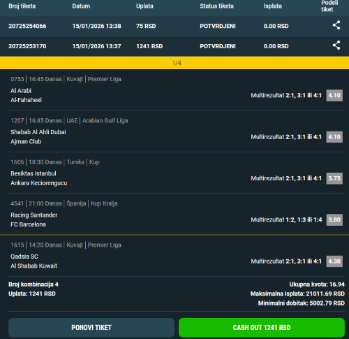 Pozdrav svima . Na meču u Singapuru već krenulo drugo poluvreme. Predloge od jutros za multi TR dublove dopuniću sa još 2 meča na ovaj tip igre. Na profilnoj slici uz 4 predloga od jutros i Slovačka 2 i Belorusija. Moj predlog su dublovi. 1 uhvaćeni dubl vraća ulog ako odigrate 2/6 . Ako se odigra sistem 3/6 min. dobitak za 3 pogotka 3.27 x ulog na sistem. Ja sam 3/6 odigrao na drugačiji način, tj dosta rizičnije. Taj tiket je na profilnoj slici. 1/2 na po 3 meča. Kvote Meridian. Ako svuda utrči po 1 pogotak ev. min. dobitak 8 x ulog. Probam tako. Što se tiče tiketa uplaćenih u Maxbetu. Jutros sam stigao da predložim 5 mečeva na pobede uz GG . Na istih 5 sam odigrao i tikete na golove favorita . Obzirom da sam dodao još 2 predloga na pobede uz GG , uplatio i opuštenu varijantu tim2+ na svih 6 favorita s profilne slike. Kvota tiketa 10.58 idem na ev. dobitak 5000 din. Pregledajte statistiku. Ko isprati nešto od predloga sretno.