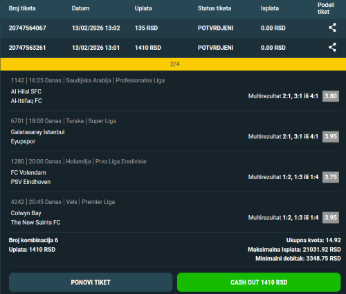 Pozdrav svima. Poklom bonus od 500 din. probam da iskoristim na tiket s kvotom 8.31 Merkur . Aris 1&2+ , Panatinaikos 1&2+ , Bajern 1&2+ , Benfika 1&2+ , Lids 1 , Fener 2 i Renžers 2. Na standardni mtr uplatio 2 tiketa . Prvi gde je Benfika u fiksu + 1/4 postavljen kao profilna slika. Na drugom Fener , Antverp , Rendžers i Lids 2/4. Uz prvu jutarnju kafu u Maxbetu uplatio samo ki na 12 timova . Na sitno , čisto da sebi obeležim mečeve za koje da pregledam statistiku. Ne očekujem prolaz tog tiketa pa ga neću ni pisati. Što se tiče tiketa uplaćenog za bonus, izbacio bih bar 2 meča sa tog tiketa da je bonus 1.000 din. Fener , Lids i Rendžers imaju nezgodne protivnike. Aris takođe nije sigurica ... Ali za 500 din. neću juriti kvotu 3 ili sl. 2/5 na standardni mtr uvek je rizik. Benfiku sam stavio na tiket jer je zadnje 3 međusobne pobedila samo sa po jednim datim golom. Nadam se večeras Estoril učačka gol. Rendžers , Lids , Fener i Antverp očekujem da prime bar po gol . Nadam se da bar na 2 utrči standardni mtr. 2/5 se isplati odigrati na standardni mtr - ako prođu bar 2. 2/6 za 2 pogotka donosi obično povrat uloga i sitnu zaradu - za 2 pogotka. Ali na 2/6 nešto veća verovatnoća da utrči 3 pogotka . A ako utrči koji viška, više dobitnihh kombinacija nego za 2/5. Pišem ovo zbog meča Aris - Niki Volos . Po onome što sam video iz statistike možda na Aris pre prođe standardni mtr nego na Antverp ili neki od timova koje sam odabrao za 2/5 . Grke izbegavam na tiketima kada je bolja ponuda... Ali danas tiket sa profilne verovatno pojačam sa Aris mtr 2:1,3:1,4.1 . To će biti kao 2/6 . Za kasnije sam ostavio tikete na pobede uz GG kao i sisteme na TR . U dilemi sam da li da odigram tiketa samo na 4-5 od ovih favorita na koje idem sa standardnim mtr ili da proberem 2-3 i dodam 2-3 favorita koji igraju posle ponoći. Paragvajci i Meksikanci... Toliko od mene za sada. Danas imam puno obaveza. Te naknadne tikete uplaćivaću tek za nekoliko sati kada stignem kući. Ako se stigne biće u komentarima predloga na pobede uz GG . Verovatno 3,4/4 ili sl. U svakom slučaju dobro pregledajte statistiku. Sretno.