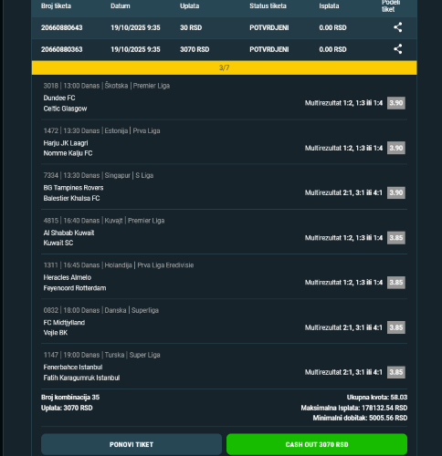 Pozdrav svima. Geylang 1&GG 1.85 , Bodo 1&GG 2.18 , Sparta P. 1&GG 2.47 i Malme 2GG 2.57 . Ukupno 25.19 Merkur. Moj ulog 200 din. Eventualni dobitak od 5.000+ din. probam da dupliram sistemom gde je Geylang u fiksu + 2/3 na preostale. Na ulog od 480 din. ev. min dobitak 1.568 din. a max 5.048 din. Meč u Singapuru u fiksu jer kreće od 13:45 . preostali tek od 19h. Po formi timova 1&GG u Singapuru je veoma izgledno za prolaz. Međutim , kad se pogledaju međusobni mečevi na prethodnih 6 Gejlang samo 1. pobeda , 2x nerešeno i 3 poraza. Zbog toga smatram da je za 1&GG premala kvota. U Februaru ove godine na prijateljskom meču Geylang - Tanjong Pagar 3:1 . Na 5 međusobnih pre toga Tanjong Pagar je postizao 3x po 2 gola i 2x po 3 gola. Zato na ovom meču probam i sa oba tima bar po 2 gola kvota 2.90 + pobede uz GG Bodo , Sparta i Malme. Kvota tiketa 40.13 na ulog od 125 din. ev. dobitak 5.000 din. Na ovo uplatio sistem Geylang - Tanjong Pagar u fiksu + 2/3 na preostale. Tiket postavljen kao profilna slika. Pregledajte statistiku. Ako neko isprati sretno.