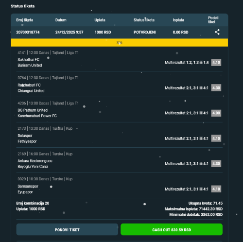 Pozdrav svima. Nadam se da je neko ispratio jučerašnje predloge. Oba tiketa dobitna. Podeliću sa vama šta sam uplatio za danas. Tiket s kvotom 5.37 Merkur : Briž 2 1.50 , Štutgart 2 1.30 , Verder 1 1.63 , Milan 1 1.33 i Sparta Prag 1 1.27 . Na ulog od 560 din. ev. dobitak 3. Bez obzira na ovako male kvote po meču tiket je veoma rizičan. Po formi timova u zadnjih 5 kola češke lige Karvina nešto bolji tim od Sparte . Po meni premalo plaćena pobeda Sparte . Rezon kladionica je verovatno da je vreme da Sparta najzad nekog pobedi. Preostala 4 favorita igraju kup utakmice . Pošto se igra samo jedan meč nadam se pobedama favorita. Tiket s kvotom 61.45 Merkur : Štutgart 2&GG 2.72 , Sparta P. 1&GG 2.65 , Verder 1&GG 2.75 i Bajern 1&GG 3.10. Na ulog od 200 din. ev. dobitak 12.200+ din. Na ovo idem i sa 4 dodatne kombinacije . Ulog od 347 din. podesio na ev. dobitak 2.000 din. za 3 pogotka. Ne bih na jači ulog . Nisam ubeđen da će Štutgart primiti gol . Bajern mi je sumnjiv kao i Sparta . Verder mi se čini najizgledniji za pobedu uz GG . Prvobitno sam imao na umu da uplatim dubl Verder 1&GG i Sparta 1&GG . Ali odlučih se za 3,4/4 . Kao profilnu sliku postavio sam sistem 2/4 na standardni mtr , kvote Meridian. Favoriti čije pobede sa 2:1,3:1,4:1 probam da uhvatim : Sparta , Verder , Štutgart i Bajern. Eventualni min. i max. dobitak na moj ulog vide se na tiketu. Za super utorak bonus od 100 din. uplatio dubl s kvotom 36.34 : Sparta P. mtr 2:1,3:1,4.1 3.95 i Verder mtr 3:2,4:2,4:3,5:1 9.20 . Za 130 din. po kvoti 23 uplatio singl na Verder mtr 1&ostalo . Ovim dublom i singlom nadam se da "pokrivam" sistem 2/4 na standardni mtr. Sparta P. ako pobedi uz GG ne očekujem prebačaj standardnog mtr. Darmšat u veoma dobroj formi , ne bi me iznenadilo da utrpa i 2 gola Verderu. Na mali ulog probam da uhvatim goleadu na ovom meču. To je sve što sam uplatio za sada. Uplatiću još par singlova i par dublova u lovu na kvote . To sam ostavio za kasnije , da još razmislim. Pregledajte statistiku . Sretno.