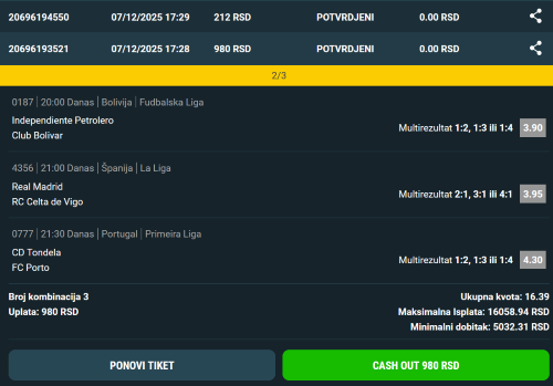 Pozdrav svima. Ferencvaroš , Bolivar , Real M. i Porto su timovi na koje probam da uhvatim pobede sa 2:1,3:1,4:1 . Kao profilna slika sistem 1/3 uz fiks na Ferencvaroš. . Na mali ulog uplatio i 4/4 po kvoti 261.66 . Uslikano da se sve bitno vidi. Kvote Meridian. Ukoliko na Ferencvaroš ne utrči standardni mtr , uplatiću 2,3/3 na preostale. Tikete uplaćene u Admiralu i Merkuru ne vredi da podelim sa vama. Nekoliko mečeva već završeno, 2 u toku... Pregledajte statistiku . Ako neko isprati sretno.
