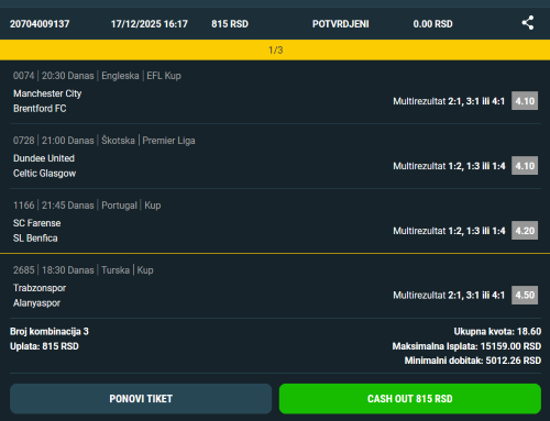 Pozdrav burazeri, Posto se uglavnom desava da sjebe jedna tekma,evo sad jedan tiket sa jednom utakmicom manje nego inace a kvote malo jace(4 para) 1.Prvi par 20:00 Breda-Alkmaar 2-2i 3+ (3) Domaćin igra bez najboljeg igrača, domaćin ekipa koja prima dosta golova, zakucani su na dno tabele, gost golgeterska ekipa, trebaju im bodovi kako bi ostali u trci za Evropu,nalaze se u top 5 ekipa u ligi, na poslednjih 5 utakmica u gostima postižu minimum 2 gola po meču. 2.Drugi par 19:00 Osnabruck - Grossaspach DP1 (4,15) - dupla pobeda(Domaćin pobeđuje I u prvom i u drugom poluvremenu) Domaćin igra odlično kod kuće, poslednjih pet Utakmica kod kuće 5 pobeda, gol razlika 33:16!, u proseku postižu dva gola po utakmici,gost u zoni ispadanja, nisu postigli gol na poslednja 3 gostovanja. 3.Treci par 21:30 Moreirense - Porto gg3+ (2,75) zanimljiv meč, poslednjih 5 međusobnih duela ova dva tima sa promenljivim rezultatima, poslednji duel u korist gosta 4:3, obe ekipe se nalaze u top 5 ekipa u ligi, domaćin ima fin skor u poslednjih 5 utakmica kod kuće, od 5 utakmica 4 pobede, dok Porto na strani u poslednjih 5 tekmi ima 3 remija I 2 pobede, 2 remija završena bez golova, treći 1:1,a pobede sa 2+ golova na strani. Očekujem veceras dosta golova kao na poslednjioj utakmici. I poslednji par za danas 4. Par Vaduz - Lausanne 20:00 2igg (3,55) Domaćin od poslednjih 5 utakmica kod kuće, u zadnje 3 postiže minimalan broj golova(2 remija I 3 poraza, nalaze se u drugom delu tabele) dok je gost u dosta boljoj formi od rivala, nalaze se na 3. Mestu na tabeli i u trci su za promociju u viši rang i samim tim verujem da imaju veci motiv i da ne bi trebali ovde da gube bodove, gol razlika sasvim dobra 32:19, u poslednje 4 utakmice postižu minimum 2 gola. Srecno ko prati,probati na neki manji /srednji ulog, kvote su iz Maxbeta Živi bili pare digli! *** expres tiket 8737597 ***