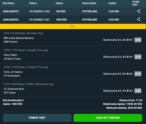 Pozdrav burazeri. Juče preko dana loše . Od predloga za mečeve od 22:30 prošao tiket s kvotom 5.57 i tripl s tipom GGI , GGII (na sva 3 meča prošlo GGII). Idemo dalje. Kao profilna slika1 , Norveška druga liga, 5 mečeva , tip GGI,GGII . Kvote se vide na slici , broj kombinacija ,kao i eventualni min. i max. dobitak na uloženih 10 din. po kombinaciji. Obično idem bar sa 20 din. po komb. na ovakav tiket. Ulog prilagođavam onome što mislim o verovatnoći prolaza. Verovatnoća prolaza svakako bar malo veća ako se izbaci četvrti i ili peti par sa tiketa. Dvoumio sam se koji da izbacim pa sam ostavio ovako. Kvote Balkanbet. U Maxbetu nešto manje plaćene kvote. Danas u ovoj ligi još 2 meča pa zašto ne pojuriti na svih 7 tip GG , kvota tiketa 17.77 Balkanbet , 16.49 Maxbet. Tiket uplaćen u obe kladionice. Za ovu objavu još tiket na golove favorita s kvotom 7.18 . 2 meča kreću od 13h , 1 pola sata kasnije a 2 od 14h. Dakle vremenski tiket. AC Kajaani - SJK Akatemia DI1+&D2+ 1.48 , Oulu - Mikkeli DI1+&D2+ 1.55 , Chemie Leipzig - Bischofswerdaer DI1+&D2+ 1.60 , Fredericia - Skive IK D2+ 1.45 , Heider SV - Teutonia Ottensen G2+ 1.35 . Nema tu šta posebno da se napominje . Kajaani još nije obezbedio opstanak , Oulu se bori za prvu poziciju ( teorijski dosta toga zavisi od meča Jaro - KTP gde će oba rivala juriti pobedu. Jaro juri pobedu u borbi za 2.mesto , KTP bi pobedom ostao u trci za prvo mesto) . Na oba favorita nešto bolje plaćen tip igre nego za ki1 , 1&2+ . D2+ , isti razlog za tip na trećem meču. Na mečevima od 14h opuštenija varijanta. Ako vam je neki od ovih 5 favorita sumnjiv, zamenite sa Hamburger D2+ , M.Siti G2+ i oni igraju mečeve u ovom vremenskom terminu. Ko isprati nešto od ovih predloga , sretno.