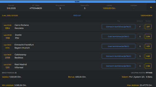 Verl - Lubeck D2+ (1,85), 3+ (1,65), GG&3+ (1,90) - kvote iz maxbeta - Da krenemo sa analizom domacina koji je za mene ovde i veci favorit nego sto to kvota govori, oni se trenutno nalaze na 10. mestu, ali sa samo 7 odigranih kola, vecina ekipa ispred njih ima 3 utakmice vise i evenutalno dobrim partijama ekipa Verl bi ozbiljno napredovala na tabeli (4-1-2, 13:8 - kuci 2-0-1, 8:4) na njihovim mecevima prosecno pada 3 gola po mecu, kuci cak 4 gola po mecu. Igraju na puno golova sto pokazuje i podatak od 7 utakmica koliko su odigrali, na cak 6 je bilo 3 ili vise golova. Imaju kvalitet sto pokazuje i pobeda protiv ekipe Saarbrucken koji je prvi na tabeli, a i odlicna igra protiv Hanse Rostock koji su jedni od kandidata za plasman u visi rang. Danasnji protivnik sa druge strane zauzima 17. mesto (2-2-5, 11:15 - u gostima 1-0-3, 6:9) prosecno na njihovim mecevima pada 2,9 gola po mecu, u gostima cak 3,8. Na cak 7 od 9 meceva kolio su odigrali postigli su makar jedan gol, dosta su lose krenuli ovu sezonu, ali 2 vezane pobede im bude nadu za bolju buducnost. Ove dve ekipe su odigrale 6 medjusobnih duela od kojih je 5 dobila ekipa Verla, na 4 su postigli 2 ili vise gola pa otud i moj predlog da domacin postigne 2 ili vise gola. Ocekujem zanimljiv duel, sa puno golova, srecno ko prati.