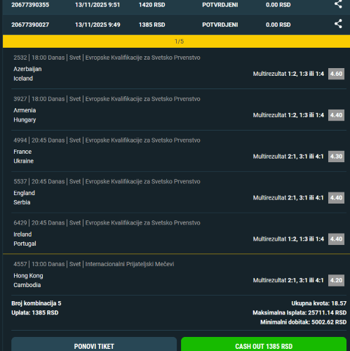 Pozdrav burazeri. Kao profilna slika tiket s kvotom 10.90 . Manje rizična varijanta Gent - Oostende GG 1.50 , St. Liege - KV Mechelen GG 1.45 , Jaro - Klubi 04 D2+ 1.42 , Kiel - J. Regensburg D2+ 1.50 , ukupno 4.63 . Bezobrazno : Jaro DI2+ 4.15 , Kiel DI2+ 4.10 , Gent 1&GG 2.85 , Standard 1&GG 3.60 , ukupno 174.57 . Jaro i Kiel sam ponovio kao dubl s kvotom 17 - da postignu bar po 2 gola u prvom. Kvote Merkur. Kiel ambciozan, Jaro krenuo porazom ali ukazujem mu poverenje na osnovu prošle sezone. Kod Belgijanaca u prva 2 kola ( u ovoj grupi) prštali golovi. Ne bi me iznenadilo da D2+&G2+ i danas prođe bar na jednom meču. U Maxbetu uplatio tripl na Belgijance : Gent GG&D2+ 2.05 , Standard GG&D2+ 2.20 , Briž GG&G2+ 2.20 , ukupno 9.92 . : Tiket na golove favorita : Jaro DI1+&D2+ 1.75 , Kiel DI1+&D2+ 1.90 , PSV DI1+&D3+ 1.70 , Riga - Spartaks DI1+&D3+ 1.70 ukupno 9.61 . Toliko za sada jer Gent kreće od 13:30 . Sretno.