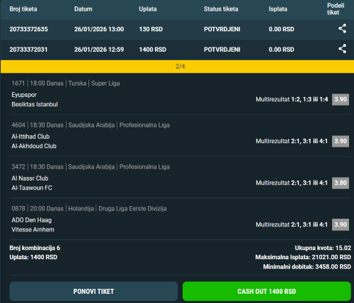 Pozdrav burazeri. Jel ste očistili sneg? Jesam se danas načistio snega ali zbog drugih stvari ovako kasno puštam objavu. Izgleda ću ovaj laptop morati da menjam. Lepa ponuda danas a ja nisam uspeo ništa da uplatim do pre sat vremena. . Za par tiketa na kojima su mi Inter i Seltik sad je kasno. Zato samo par predloga . Od mečeva koji su u ponudi od 20:00 pa na dalje , odabrao sam 4 za pojuriti 1&GG . Prvi tiket koji sam uplatio možete pogledati na profilnoj slici. Na AZ Alkmar , Sporting , Ferretti i Alajuelense pojurio standardni multi tr . 2-4 gola favorita uz 1 primljen. Kvota tiketa 286.77 Meridian. Naravno na mali ulog. Idem na eventualni dobitak od 30.000 din. u slučaju da prođe tiket. Po meni verovatnoća prolaza tiketa jako mala. Ali na sitno pa kako bude. Ono čemu se nadam je prolaz bar jednog dubla. To sa profilne slike odigrao i kao 2/4 . Idem na eventualni dobitak od 3.000 din. po dublu. U maxbetu sam na sva 4 meča išao sa 1&GG . Kvota tiketa 76.87 na mali ulog i eventualni dobitak od 10.000 din. To sam odigrao i kao 3/4 takođe na mali ulog . Idem na eventualni dobitak od 5.000 din za 3 pogotka. Nisam optimista za 4 pogotka ali 3 možda i utrči. Na sva 4 meča ću pojuriti i tim tačno golova prvo poluvreme . Još se razmišljam da li samo Alkmar da probam D2+ prvo ili i Ferretti i Alajuelense. Toliko od mene za danas. Kad pregledate statistiku odlučite vredi li pojuriti 1&GG na ovim mečevima. Sretno.