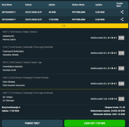 Pozdrav svima . Sretan uskrs onima koji danas slave. Za one koji vole da rizikuju po vremenskom terminu na profilnoj slici tiket s kvotom 51.45 . U nešto manje rizičnoj varijanti na Altglienicke i Heidenheim išao sa 1&2+ a na Šalke i Paderborn samo GG3+ ali sam na to dodao Bangkok 1&2+ . Kvota tiketa 14.08 . Moj ulog 350 din. za ev. dobitak 5.000 din. Altglienicke i Heidenheim nisam ubeđen da će pobediti uz GG ali ima nekih rezončića. Šalke i Paderborn timovi kojima dajem prednost kada je u pitanju tip GG&tim2+ . Razmišljao i o 2&GG na oba meča ali nekad valja biti i malo oprezniji. 1&GG na Altglienicke i Heidenheim razmišljam da vežem sa 2&GG na Tammeka - Kalju koji kreću od 13.30 , zatim 14:30 Austria Vienna - Salzburg 2&GG a probao bih sa 1&GG na Kalmar - Degerfors (15:00) i 17:30 Hoffenheim - G. Fürth 1&GG . Ako bi se odigralo svih 6 u glavu , kvota tiketa 575.53 . Ja sam to uplatio za 50 din. čisto da bih mogao kopirati tiket i onda odigrati nešto pametnije. Pisao sam u komentaru prošle objave. Razmišljam da li da probam sa 4/6 ili da izbacim 1-2 sumnjiva. Razmislite i vi o ovim pobedama uz GG . Probajte bar sa triplom. Toliko za sada. Kad pregledate statistiku odlučite vredi li ispratiti ove predloge. Sretno.