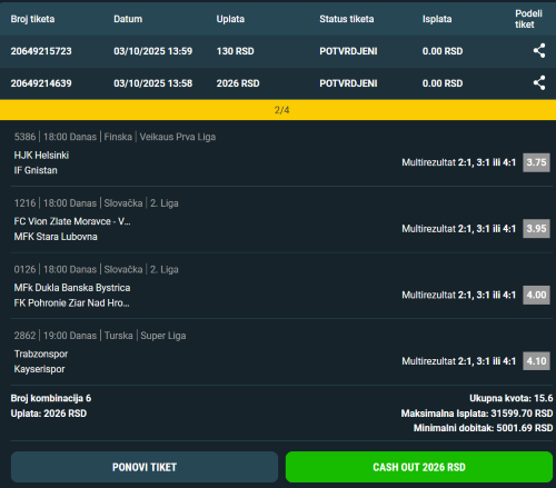 Pozdrav svima. Podeliću sa vama šta sam uplatio za danas. Kada pregledate statistiku odlučite vredi li šta ispratiti. Kao profilna slika sistem na pobede uz GG kvote Merkur. West Ham - Brighton u fiksu zbog razlike u kvotama a preostali 2/4 . Probam i sa 3,4/4 na preostale. Zabave radi pojurio i sisteme Na pobede favorta sa 3:1. Standardno , idem na ev. dobitak 5.000 din. za 2 pogotka + ostalo na sitno. U kladionici Meridian ograničenje tipova igara za meč FA kupa. Tako da tamo idem bez tog meča. Uplatio tripl + 2/3 na standardni mtr. Seltik mtr 1:2,1:3,1:4 4.0 , Rendžers ntr 2:1,3:1,4:1 4.10 , Milan mtr 2:1,3:1,4.1 4.30 . Takođe idem i sa 1/3 na standardni + fiks Vest Hem 1&2+ kvota 3. To je sve što sam uplatio za danas. Ako neko isprati nešto od ovih tiketa sretno.