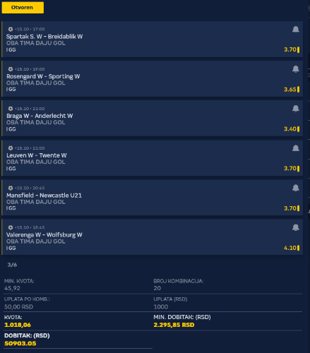 Pozdrav svima. APP tripl: 13:00 Henan Songshan Longmen - Qingdao West Coast 1&GG 2.60 , 14:00 Wuhan Three Towns - Shanghai Port 2&GG 2.37 i 18:00 Al Ahly - Zamalek GG&D2+ 2.80 . Ukupno 17.25 Merkur . Idem na mali ulog i eventualni dobitak 3.000 din.S tim da ako ovo prođe moj dobitak bi bio 12.000 din. jer sam na ovo išao i sa 2/3 . U kladionici Meridian današnji meč u Egiptu nije u ponudi . Kinezi jesu. Na Kineze uplatio dubl na standardni mtr po kvoti 14.44 . Na ulog od 210 din. ev. dobitak 3031 din. Probam ih i sa 1/2 uz standardni mtr 1/2 na meču Danska - Srbija - tiket postavljen kao profilna slika . Na mali ulog kombinovao i mtr na prebačaj golova standardnog mtr na ovom meču uz Kineze 1/2 na standardni mtr. Ako neko isprati sretno.