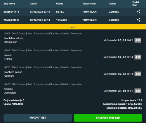 Pozdrav svima. Tiket s kvotom 15.56 Maxbet postavljen kao profilna slika. Rendžers , Tvente , Bodo i Porto 1&1+prvo&1+drugo , Fener, Kopenhagen i Slavia P tim2+. Na standardni mtr idem bez Portugalaca. Uplatio sistem 3/6 . Kvote su od 3.80 do 4.0 Meridian. Na ulog od 1.052 din. ev. min. dobitak 3.000 din. a max 63.000+ din. Da sam na isti ulog uplatio sistem 2/6 ev. min. dobitak bi bio 1.026 din. a max. 16.000+ din. Na jači ulog pametnije je ići sa 2/6 . U kladionici meridian tip TR ostalo prolazi u slučaju da neki tim postigne bar 5 golova. Probam sa TR ostalo na Rendžers 5.80 i Bodo 3.50 . Ukupno 20.3 . Na ulog od 150 din. ev. dobitak 3.045 din. Zabave radi uz 7 favorita sa tiketa 15.56 dodao Plzen i AZ Alkmar . U sistemima na TR pojurio pobede sa 3:1 . Na mali ulog . To je sve što sam uplatio za danas . Pregledajte statistiku. Ako neko isprati nešto od ovih predloga sretno.