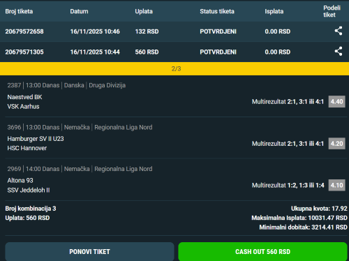 Pozdrav svima. Tiket s kvotom 5.12 na 4.ligu Nemačke postavljen kao profilna slika . Tiket 2 : Nots Kaunti 1 1.48 , Forest Grin 1&2+ 1.47 , Karlajl 1&2+ 1.63 , Jork 1&2-5 1.65 . Ukupno 5.85 . Moj ulog na oba tiketa po 1.000 din. zbog nagradne igre . Tipovi igre prlagodio uslovu otključavanja bonusa. Tripl : Mepen 2&GG 2.53 , Oldenburg 1&GG 2.33 , Nots Kaunti 1&GG 3.21 . Ukupno 18.92 Admiral. Moj ulog 520 din. Eventualni dobitak 10.000+ din. Na ovo idem i sa 2/3 na 3 zasebna dubla. Ulog podesio na ev. dobitak 5.000 din. po dublu. Tikete uplaćene na standardni mtr nemam vremena da pišem. Za par minuta krećem od kuće. Pregledajte statistiku. Odlučite vredi li šta ispratiti. Sretno.